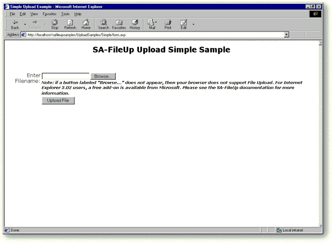 <HTML> <HEAD> <TITLE>Please Upload Your File</TITLE> </HEAD> <BODY> <form enctype="multipart/form-data" method="post" action="formresp.asp"> Enter filename to upload: <input type="file" name="f1"><br> <input type="submit"> </form> </BODY> </HTML>